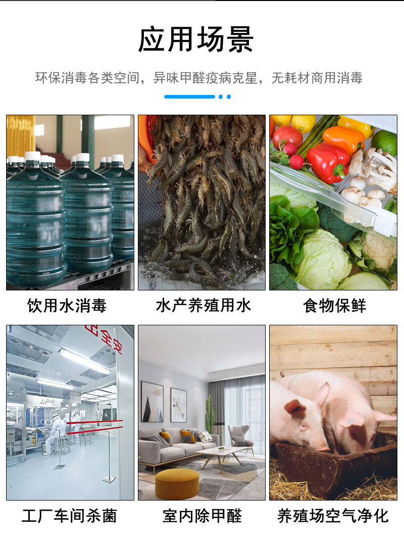 產(chǎn)品適用于對(duì)室內(nèi)環(huán)境空氣、水處理殺菌和特定作業(yè)空間的消毒凈化。如魚塘、泳池、辦公室場(chǎng)所、醫(yī)院、學(xué)校、會(huì)議室、檔案室、娛樂場(chǎng)所賓館等:食品、飲料、醫(yī)藥等行業(yè)的生產(chǎn)車間、冷庫(kù)、更衣室和其他無(wú)HVAC潔凈區(qū)的空間消毒滅菌。