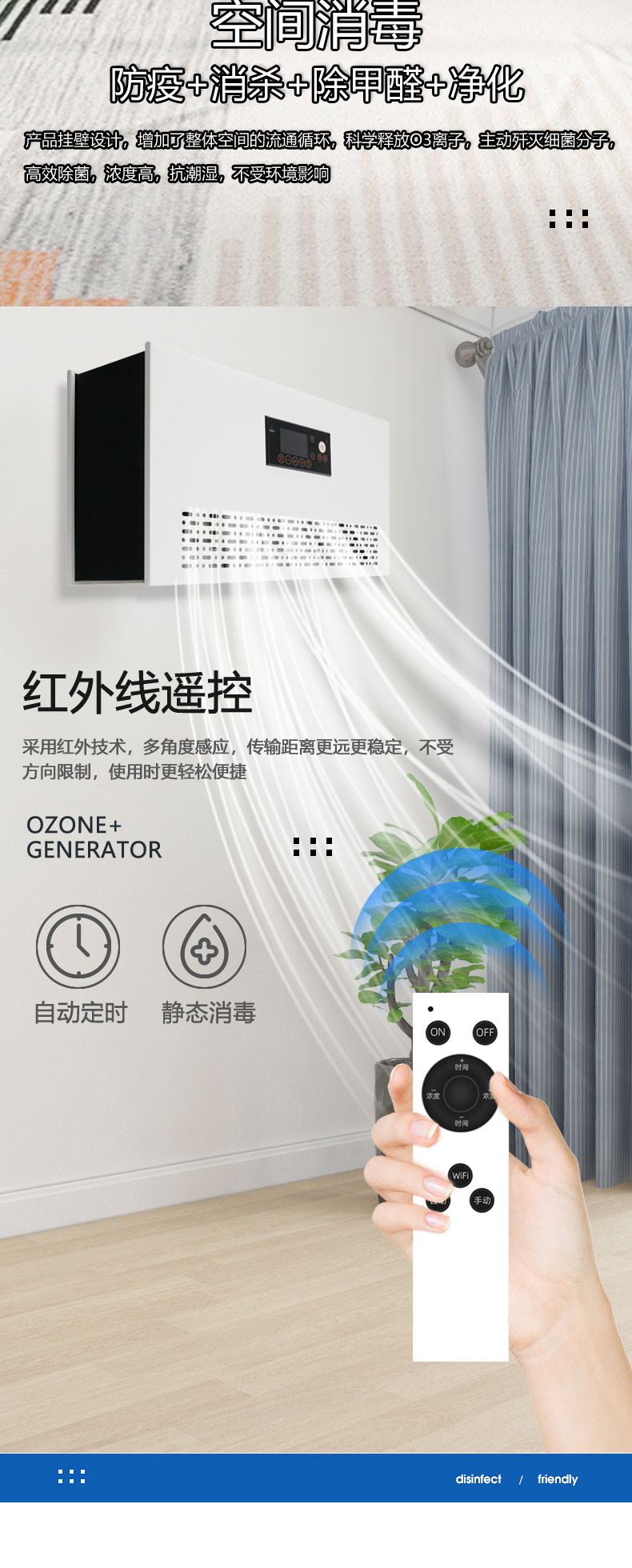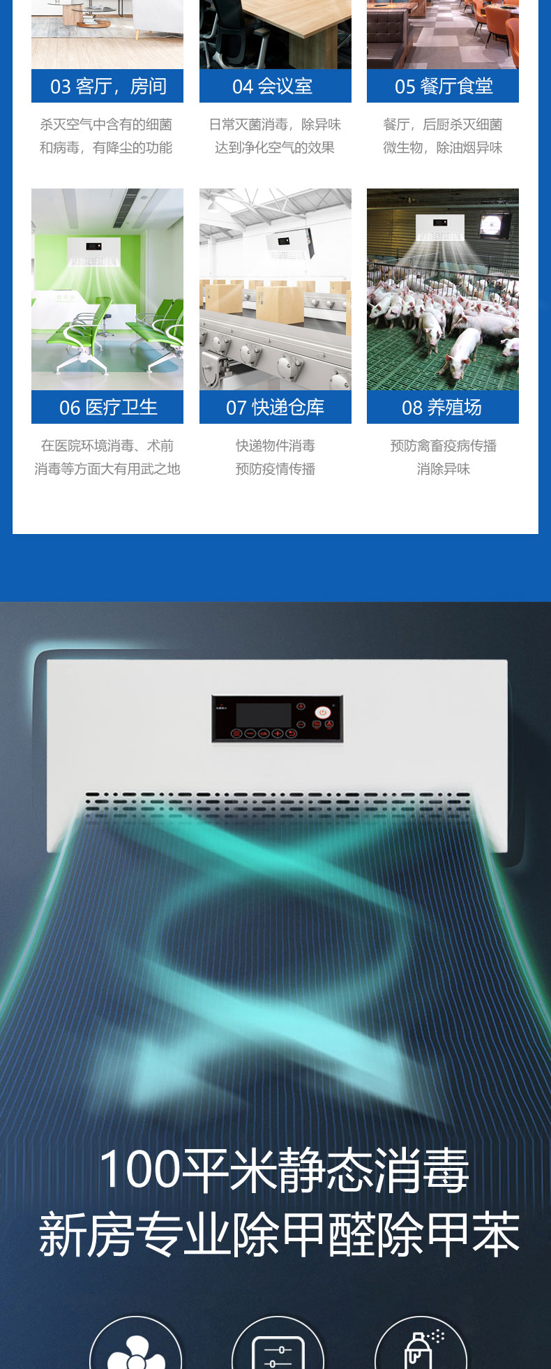 產(chǎn)品廣泛應(yīng)用于食品加工等場(chǎng)所的空間消毒,化妝品加工、包裝車間、無菌室的消毒殺菌,水產(chǎn)品、冷凍、腌臘食品的表面除菌,生產(chǎn)設(shè)備及工器具的表面消毒,各種娛樂場(chǎng)所空間消毒。